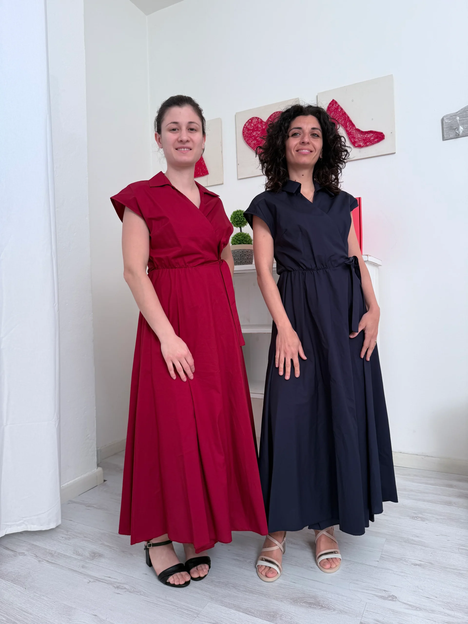Descrizione: Abito a kimono in cotone con colletto da camicia, senza maniche. Chiusura a portafoglio con laccetto interno ed esterno, elastico in vita.