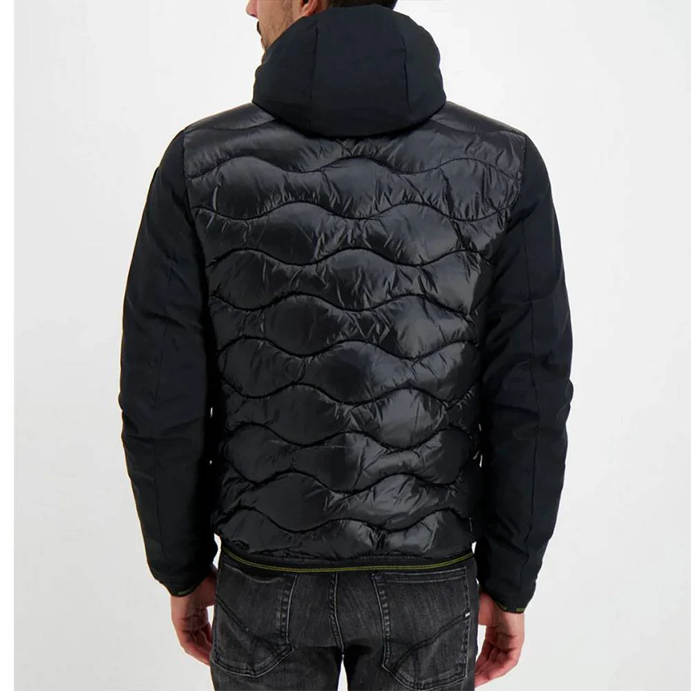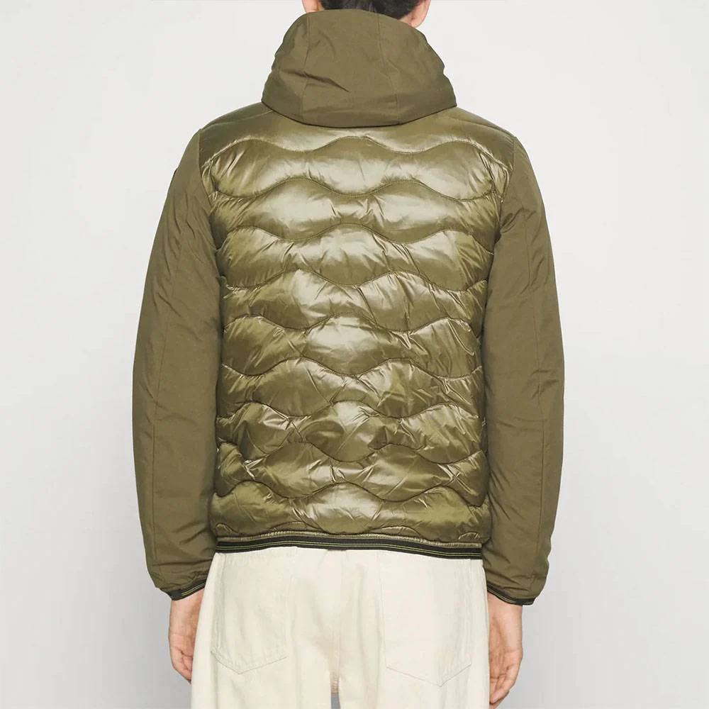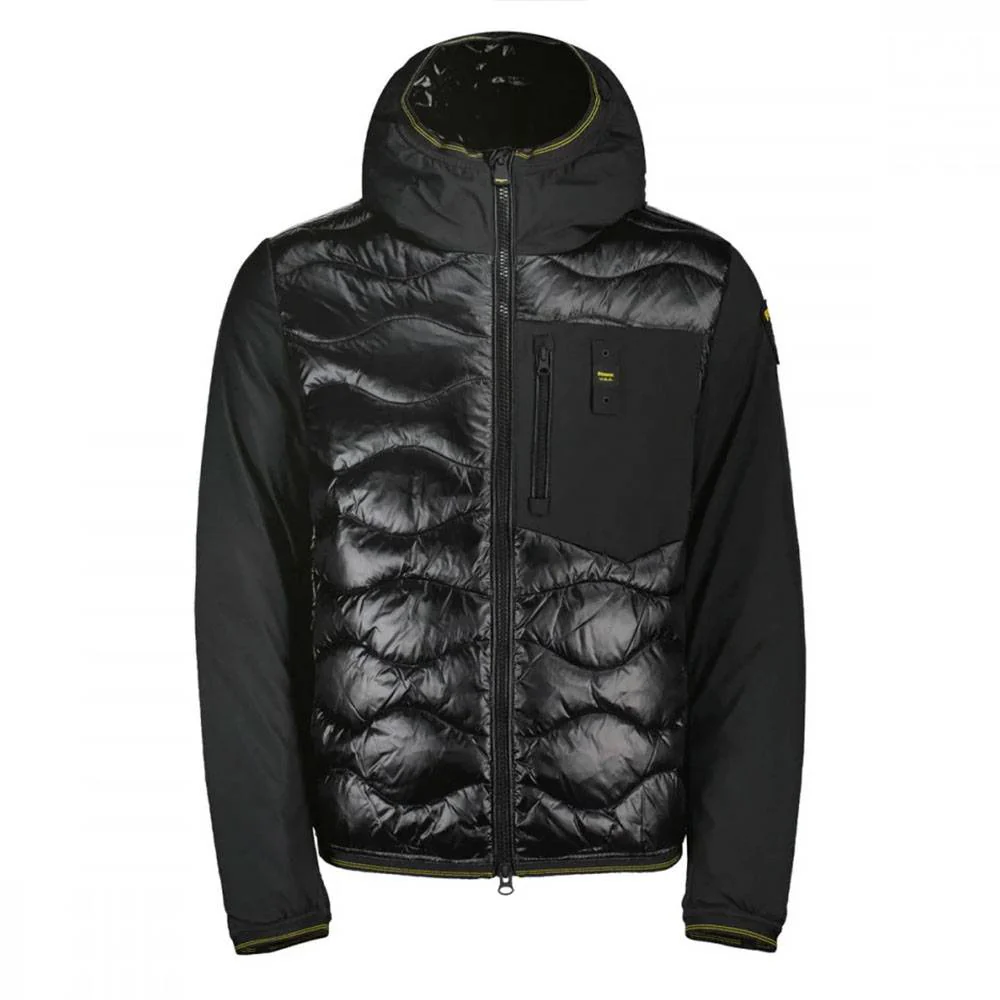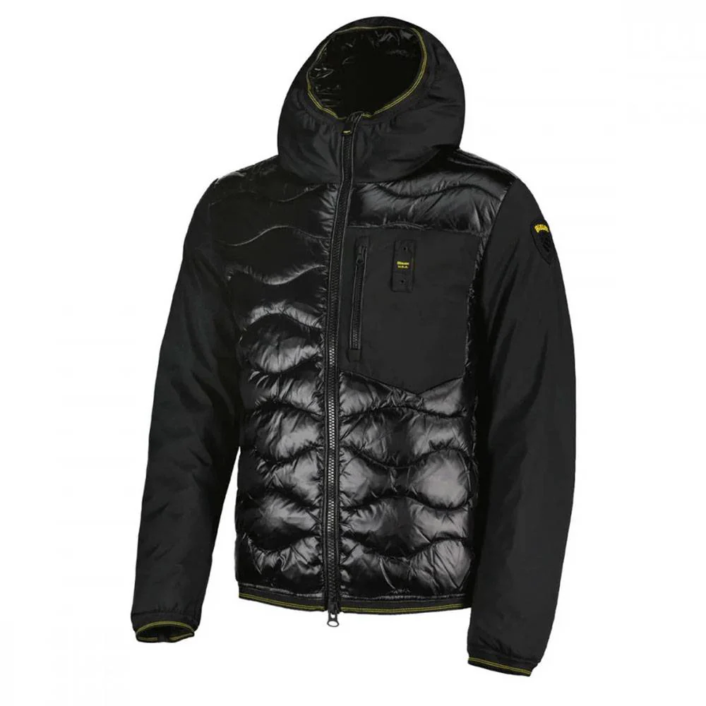 Il piumino Blauer con cappuccio da uomo รจ il remake dell’iconico modello con trapuntatura ad onde, proposto con la combinazione di due tessuti, per un design tecnico e grintoso. Realizzato in nylon micro ripstop lucido con impuntura ad onde nella parte centrale e maniche, cappuccio e tasca sul petto in neoprene morbido e antivento, ripara perfettamente dalle condizioni climatiche avverse grazie all’imbottitura mista in 45% piumino, 5% piuma d’anatra e 50% poliestere. I dettagli semplici ne fanno il capo ideale per ogni occasione: zip frontale a doppio cursore, maniche e fondo bordati con elastico operato, tasche laterali con zip ed interne con velcro, taschino al petto con caratteristico passante Blauer e Patch sulla manica a sinistra per un look autentico.
