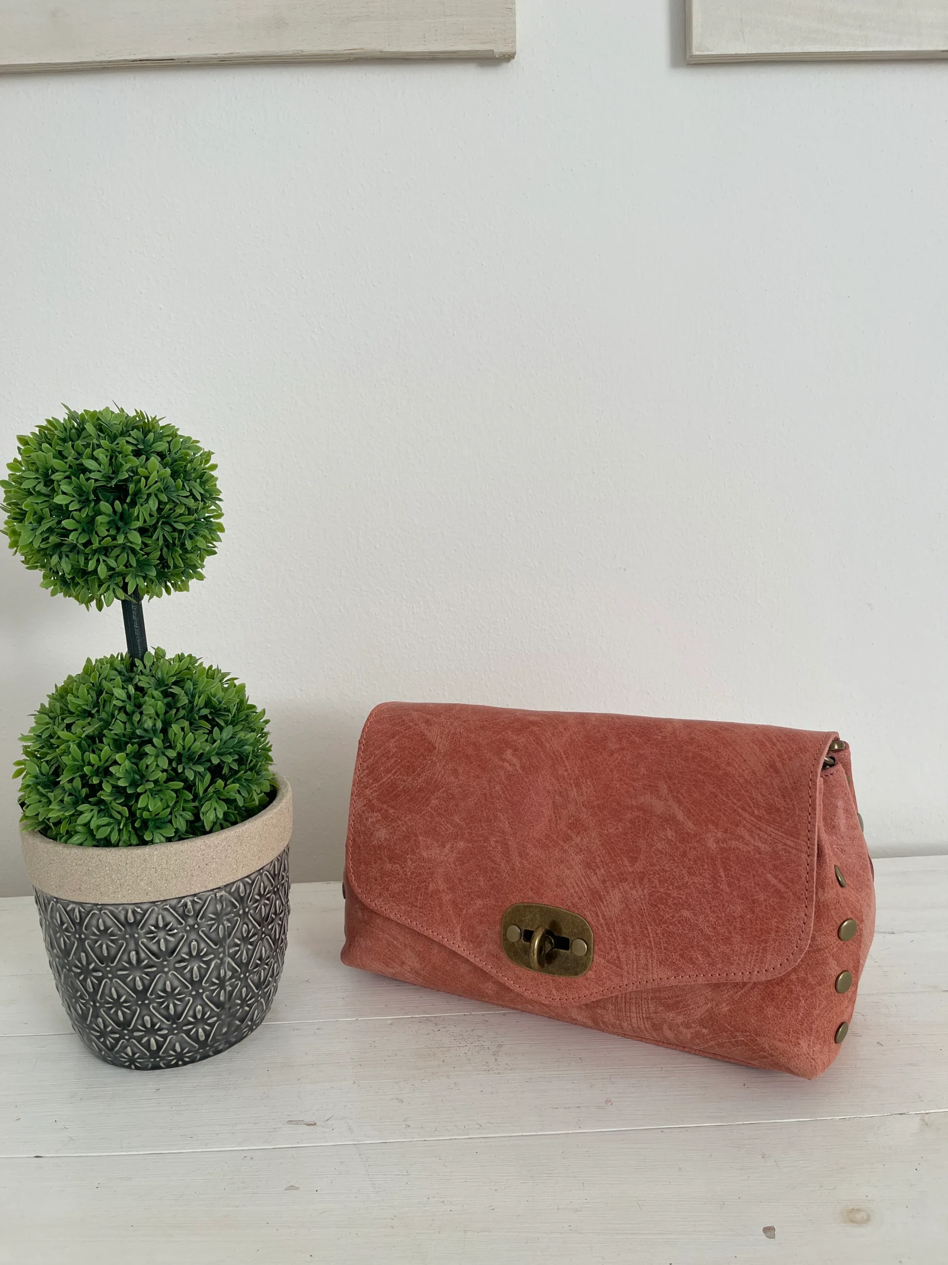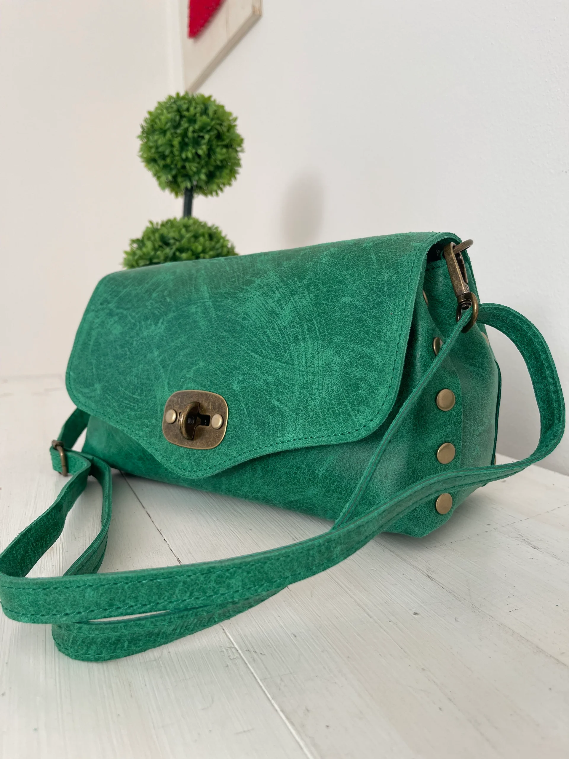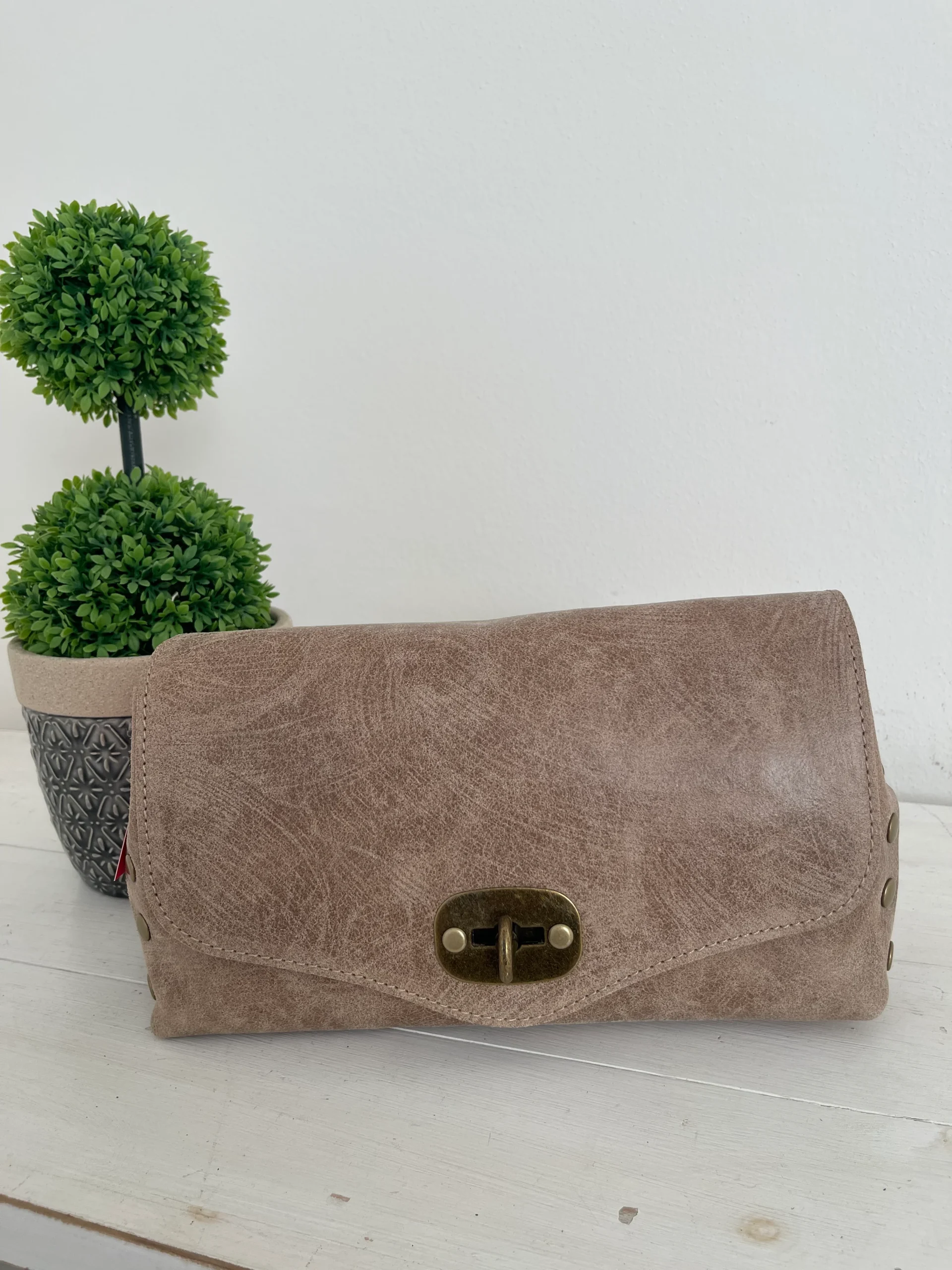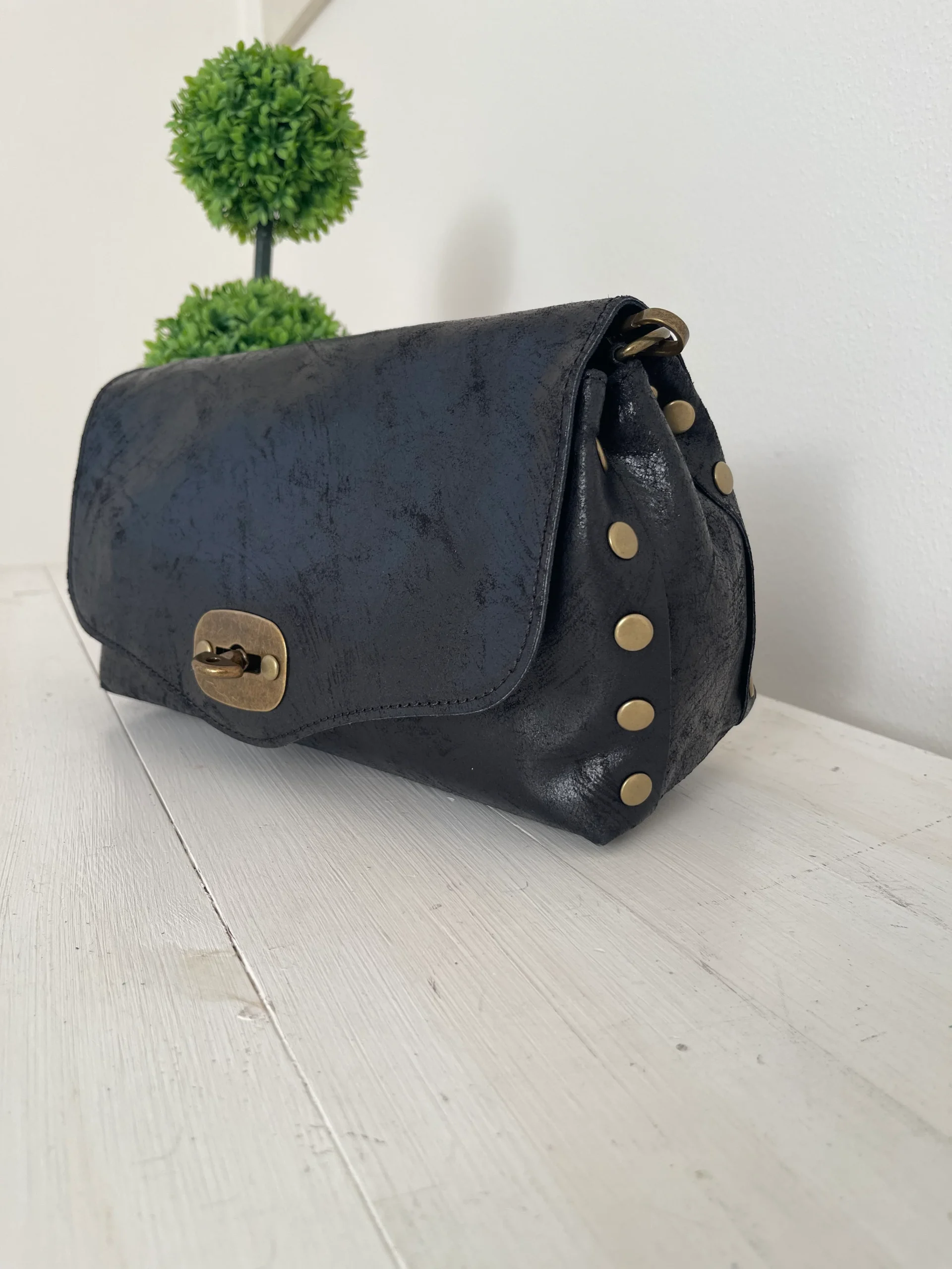 La chiusura frontale รจ dotata di un fermo con dettaglio tipo chiave, che dona un tocco vintage e originale. Il modello รจ impreziosito da borchiette decorative, che aggiungono carattere e personalitร .
