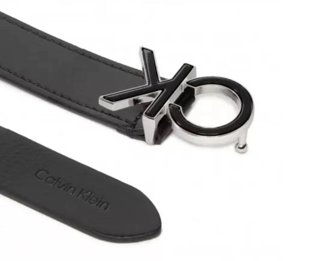 Calvin Klein cintura da donna logo CK. Cintura nera realizzata in pelle pieno fiore con fibbia ad ardiglione logo CK di colore nero con bordi argento.