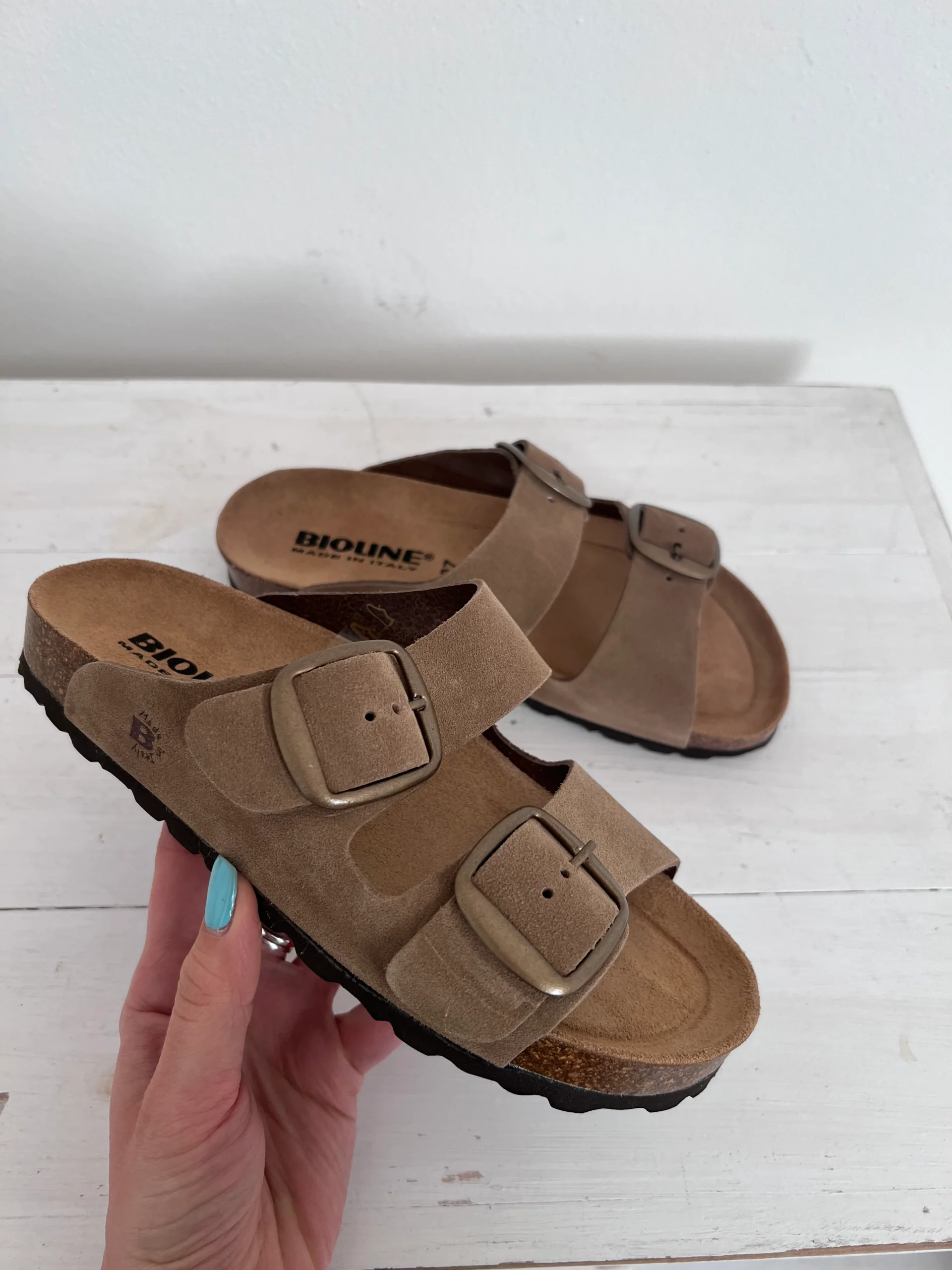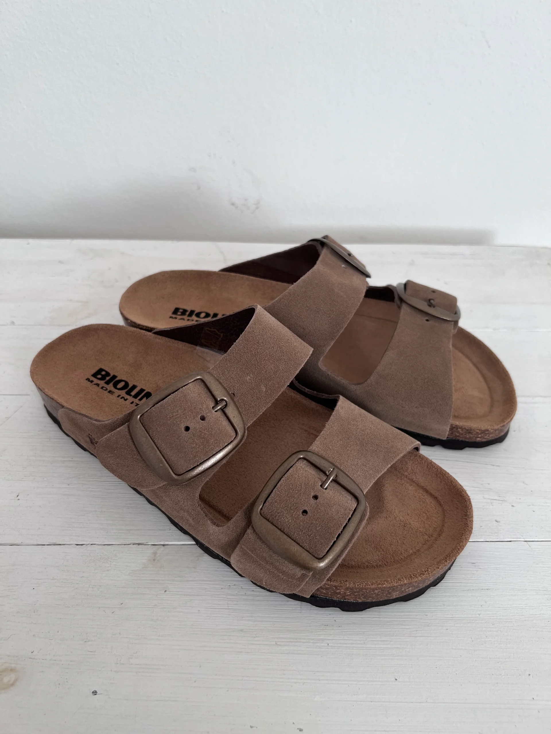 Pianella regolazione due fibbioni metallizzati con tomaia in pelle nabuk, sottopiede morbido in gomma-sughero ricoperto in pelle e battistrada in EVA (etil vinil acetato) 8mm.