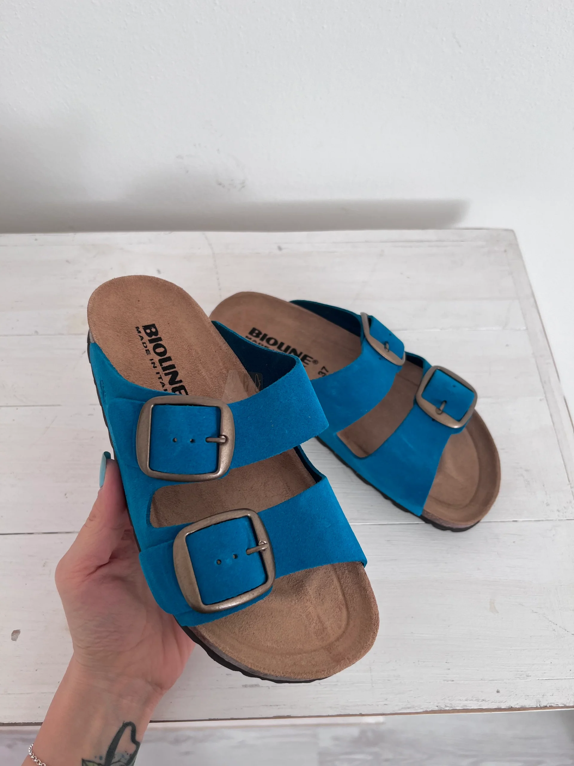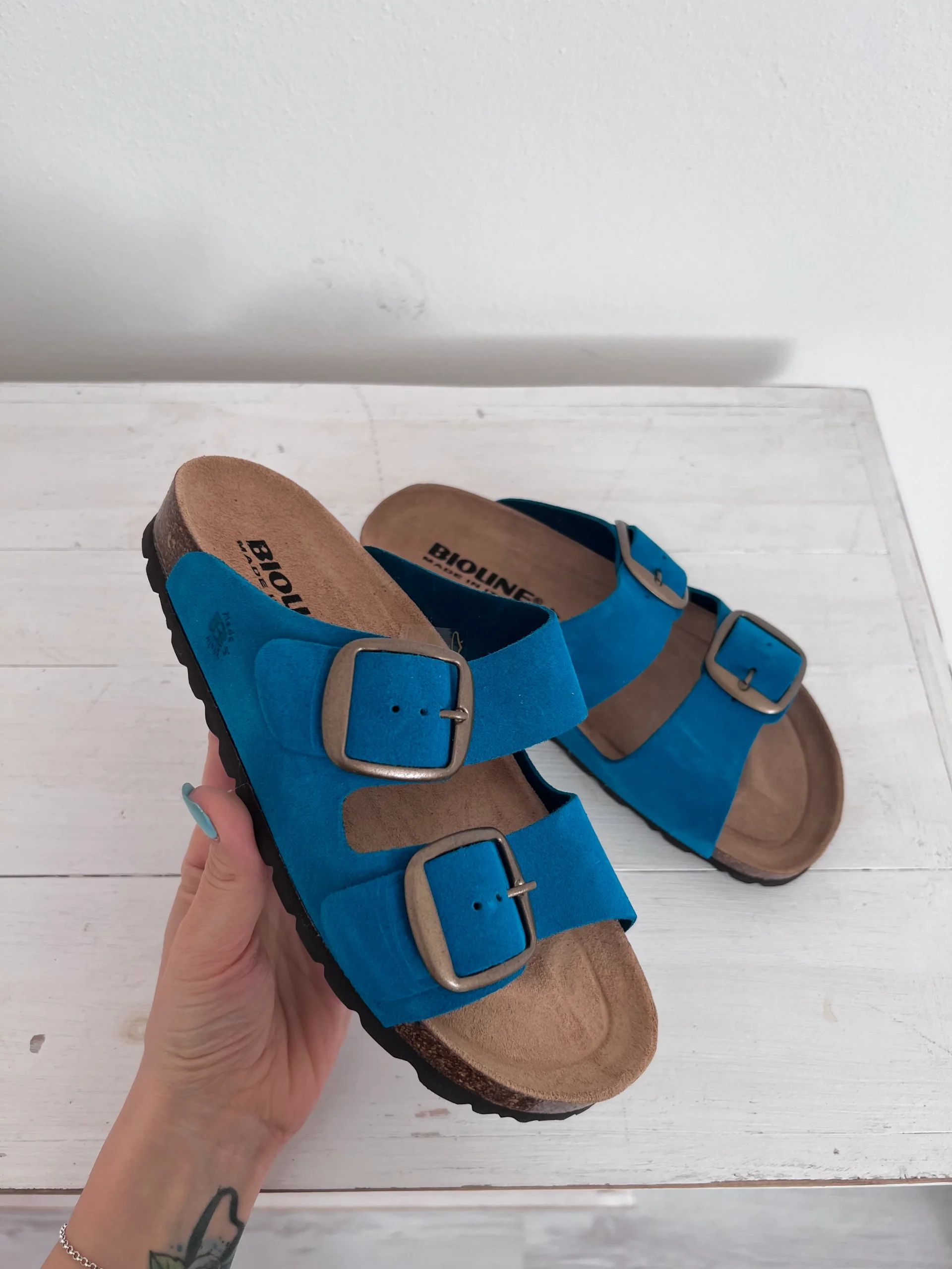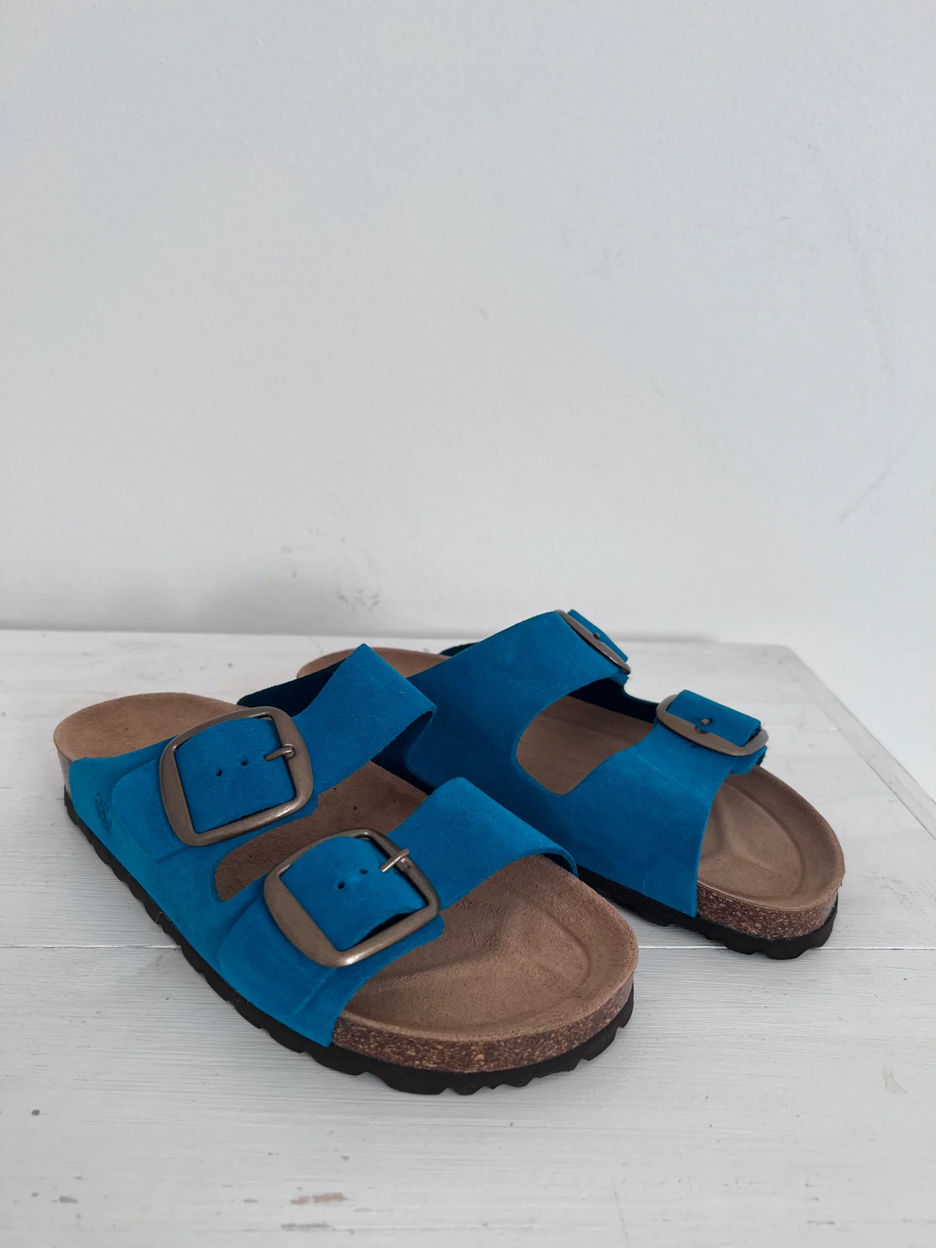Pianella regolazione due fibbioni metallizzati con tomaia in pelle nabuk, sottopiede morbido in gomma-sughero ricoperto in pelle e battistrada in EVA (etil vinil acetato) 8mm.