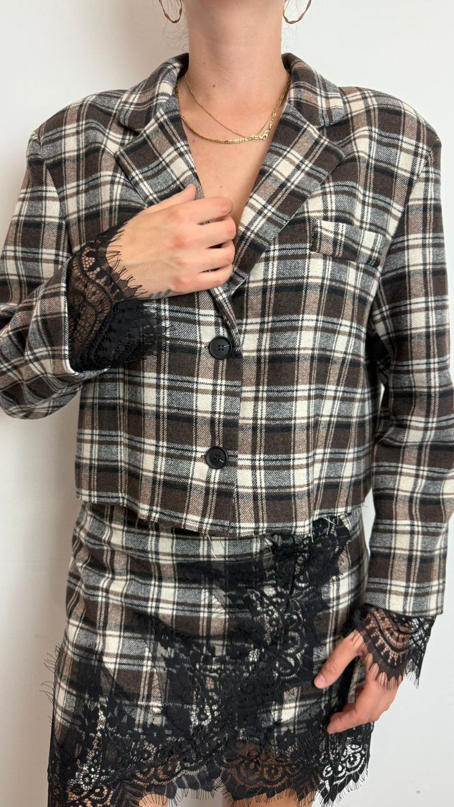 Giacca Crop Scozzese In Flanella, Maniche Lunghe Con Polsino In Pizzo, Fondo Con Taglio Vivo – Souvenir cod. S38M0971