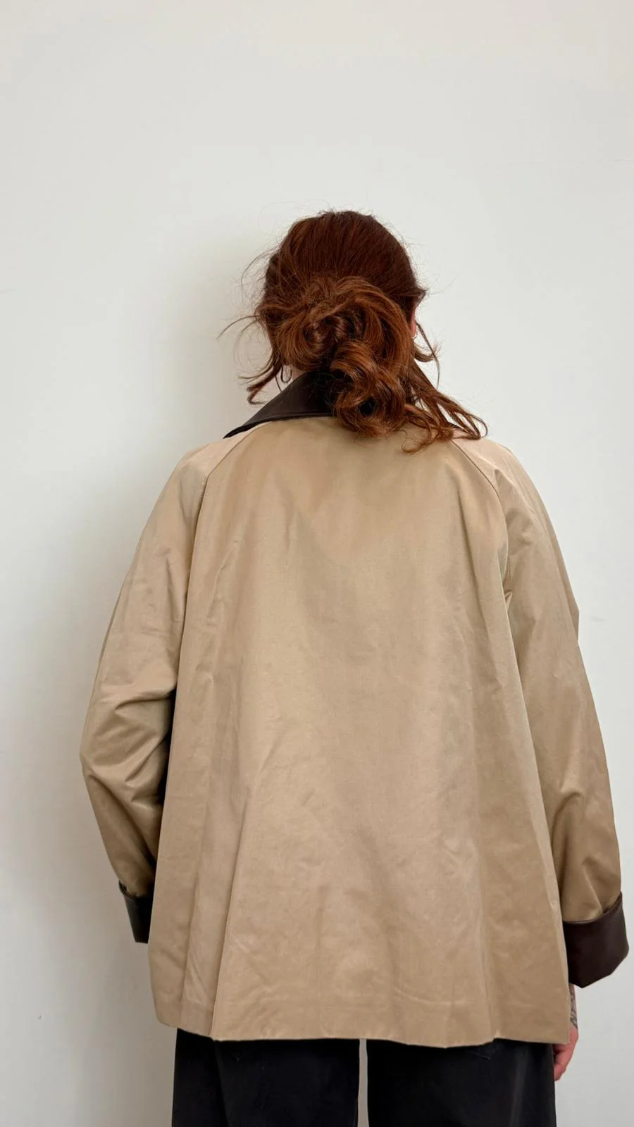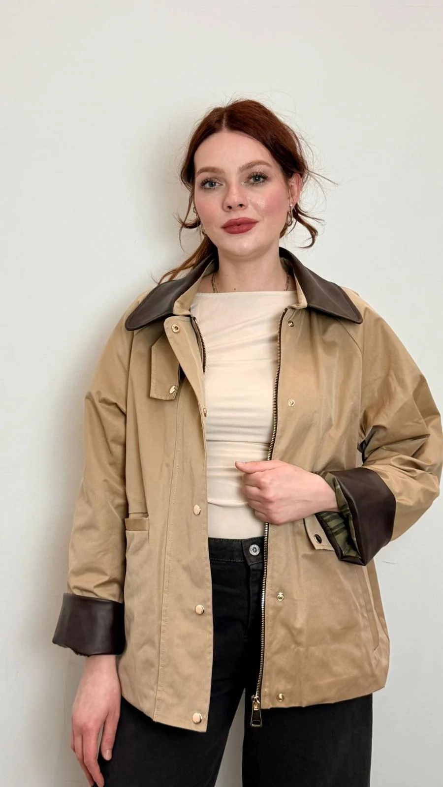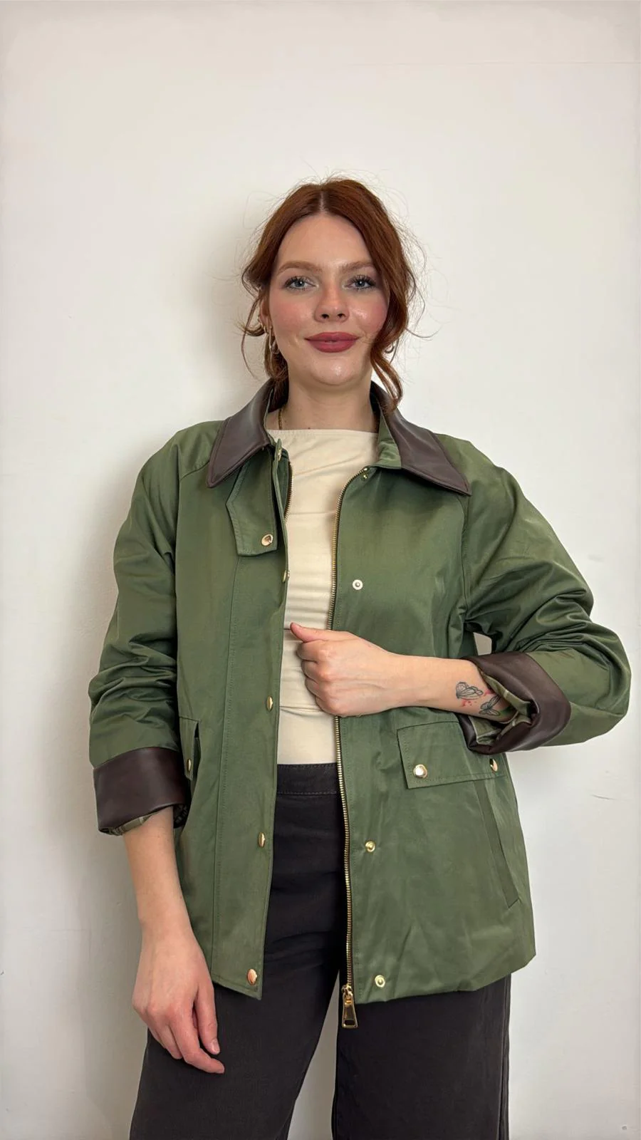 Giacca impermeabile donna in tessuto tecnico verde con colletto e dettagli a contrasto marrone. Chiusura con zip e bottoni a pressione, tasche frontali e vestibilitร comoda. Perfetta come giacca mezza stagione per look casual chic e urban. COMPOSIZIONE 49%CO 39%PL 12%PA – 100% PL – 65%VI 35%PL