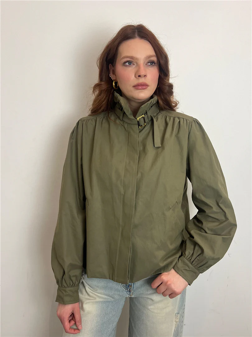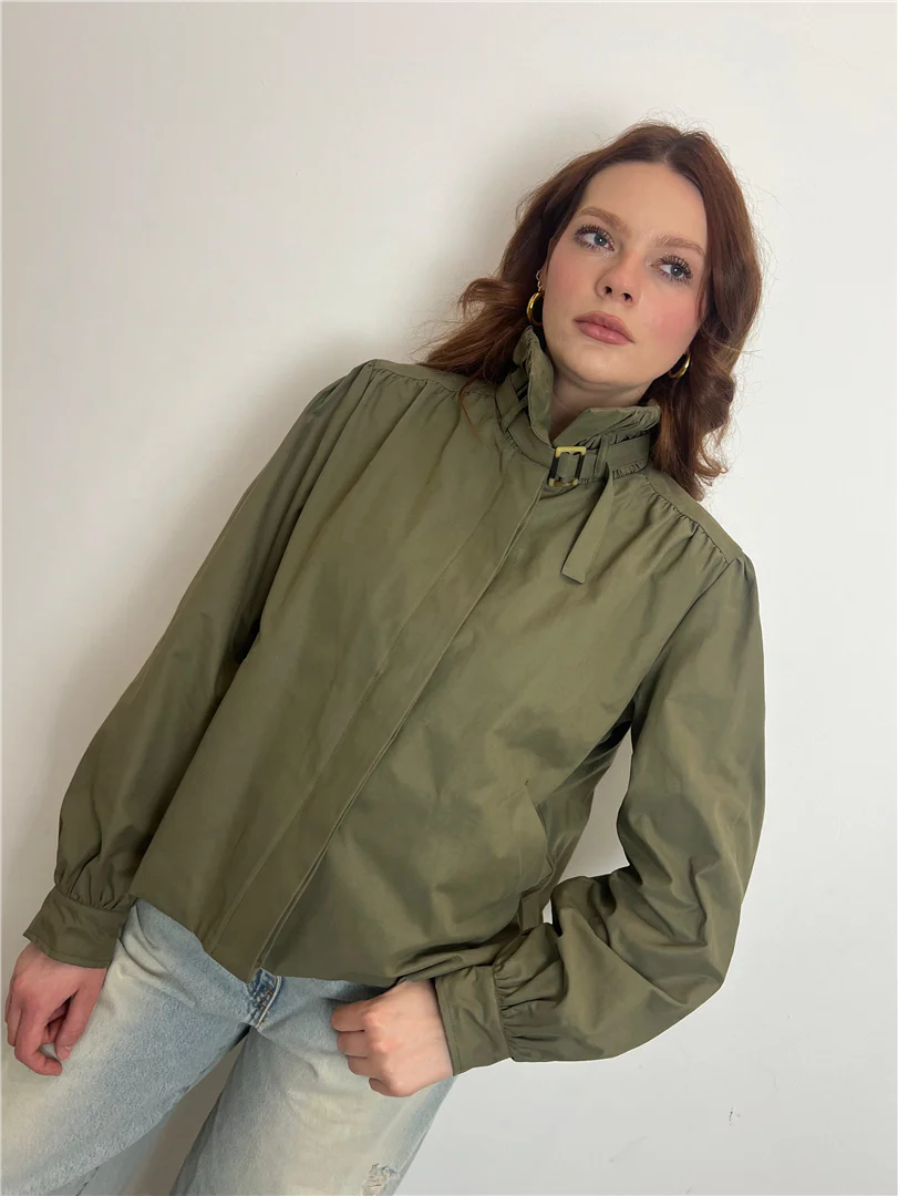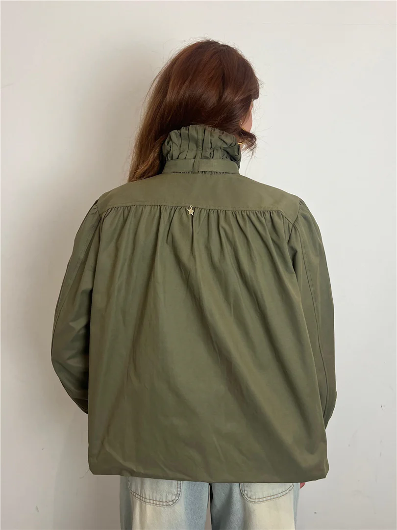 Giacca Souvenir oversize verde con collo arricciato. Design contemporaneo e dettaglio romantico per un look unico e di carattere.