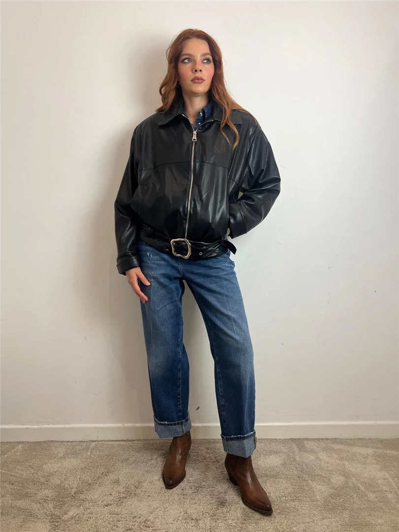Giubbotto HAVEONE in ecopelle nera dal design contemporaneo e vestibilità morbida. Modello con zip frontale, colletto strutturato e cintura in vita con maxi fibbia metallica che valorizza la silhouette. Perfetto per outfit casual chic con jeans e stivaletti, ideale per la mezza stagione.