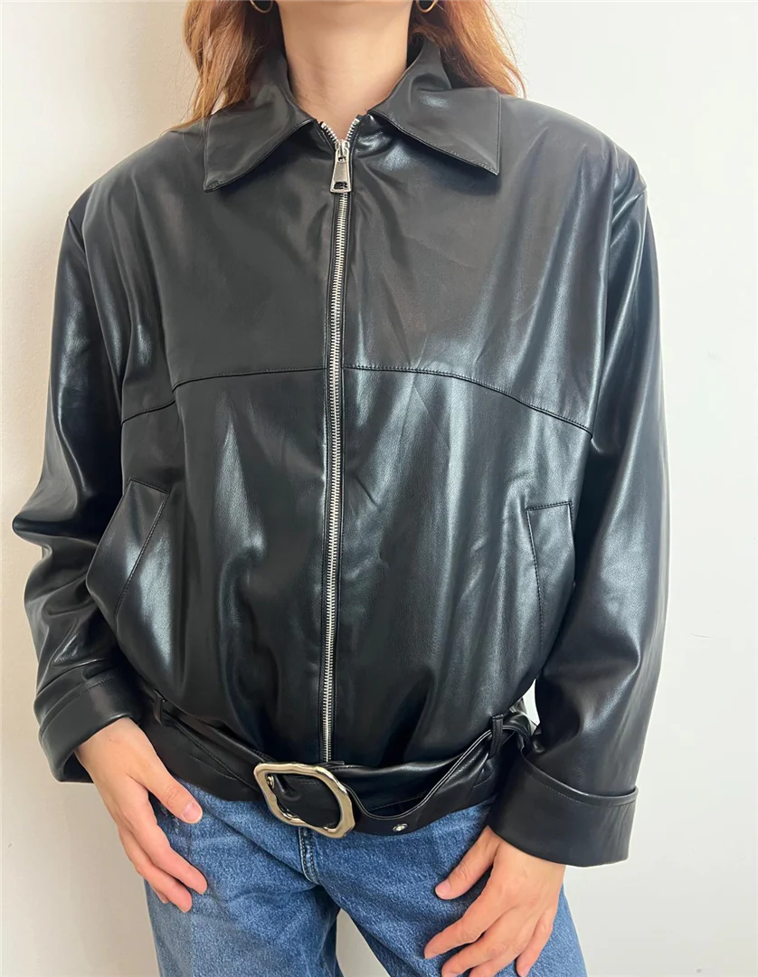 Giubbotto HAVEONE in ecopelle nera dal design contemporaneo e vestibilità morbida. Modello con zip frontale, colletto strutturato e cintura in vita con maxi fibbia metallica che valorizza la silhouette. Perfetto per outfit casual chic con jeans e stivaletti, ideale per la mezza stagione. codice artiolo KVS-P064