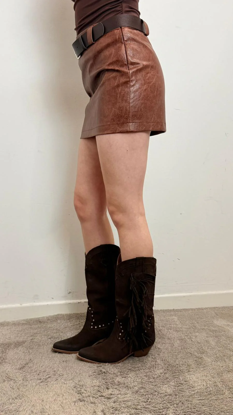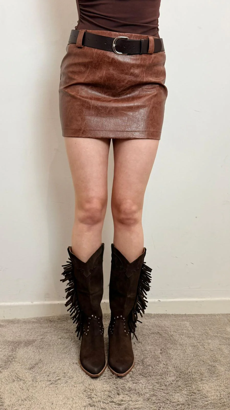 Gonna mini in ecopelle color tabacco con effetto vintage e vestibilità aderente. Modello a vita alta con cintura abbinata, perfetta per valorizzare la silhouette e creare look grintosi e femminili. Ideale da abbinare a biker, stivali o camicie per outfit di tendenza.