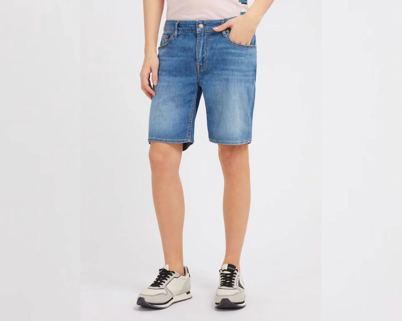 Shorts in jeans di misto cotone. Modello 5 tasche classico. Vita bassa. Vestibilitร slim. Chiusura frontale con bottone e cerniera lampo.