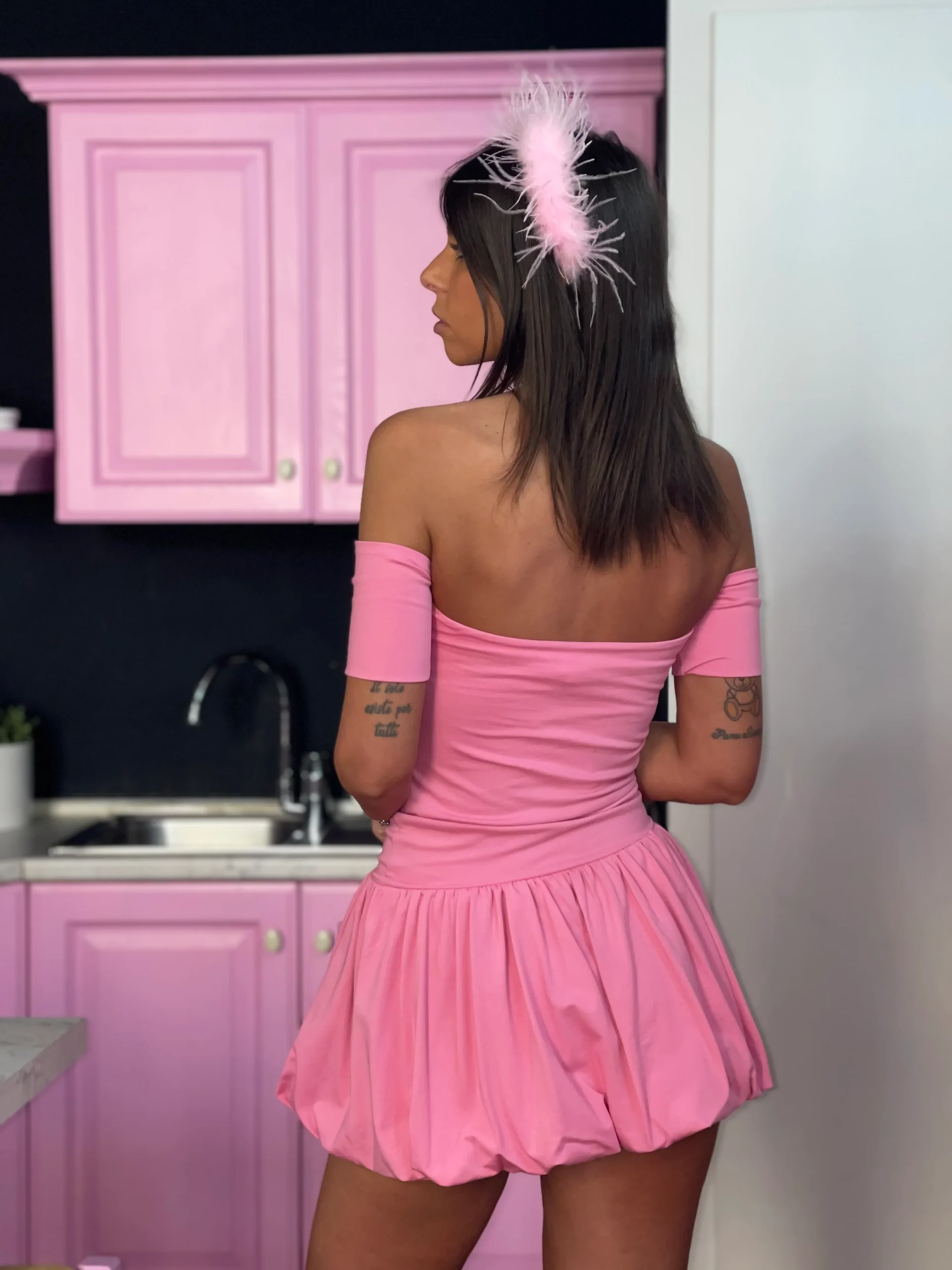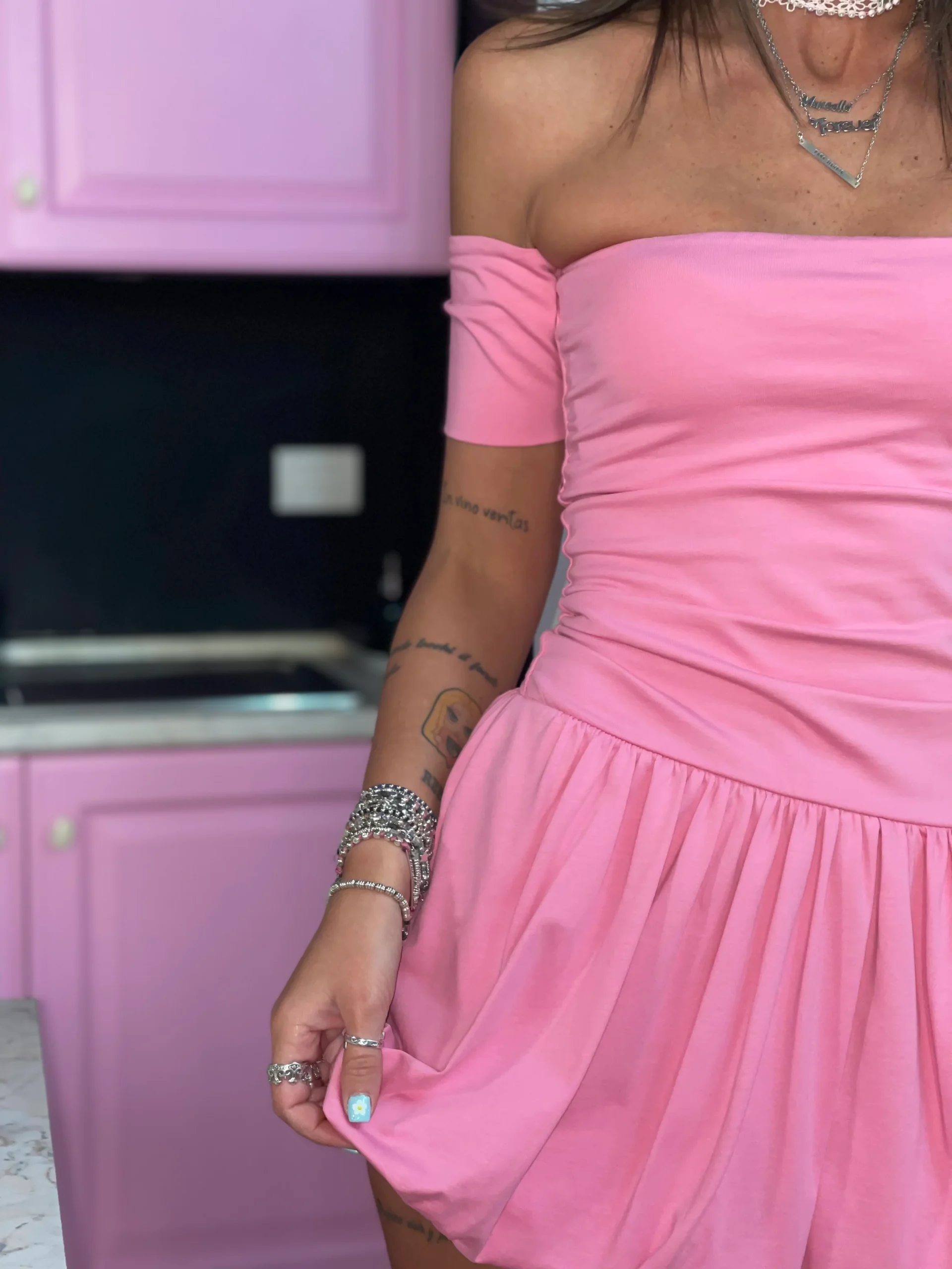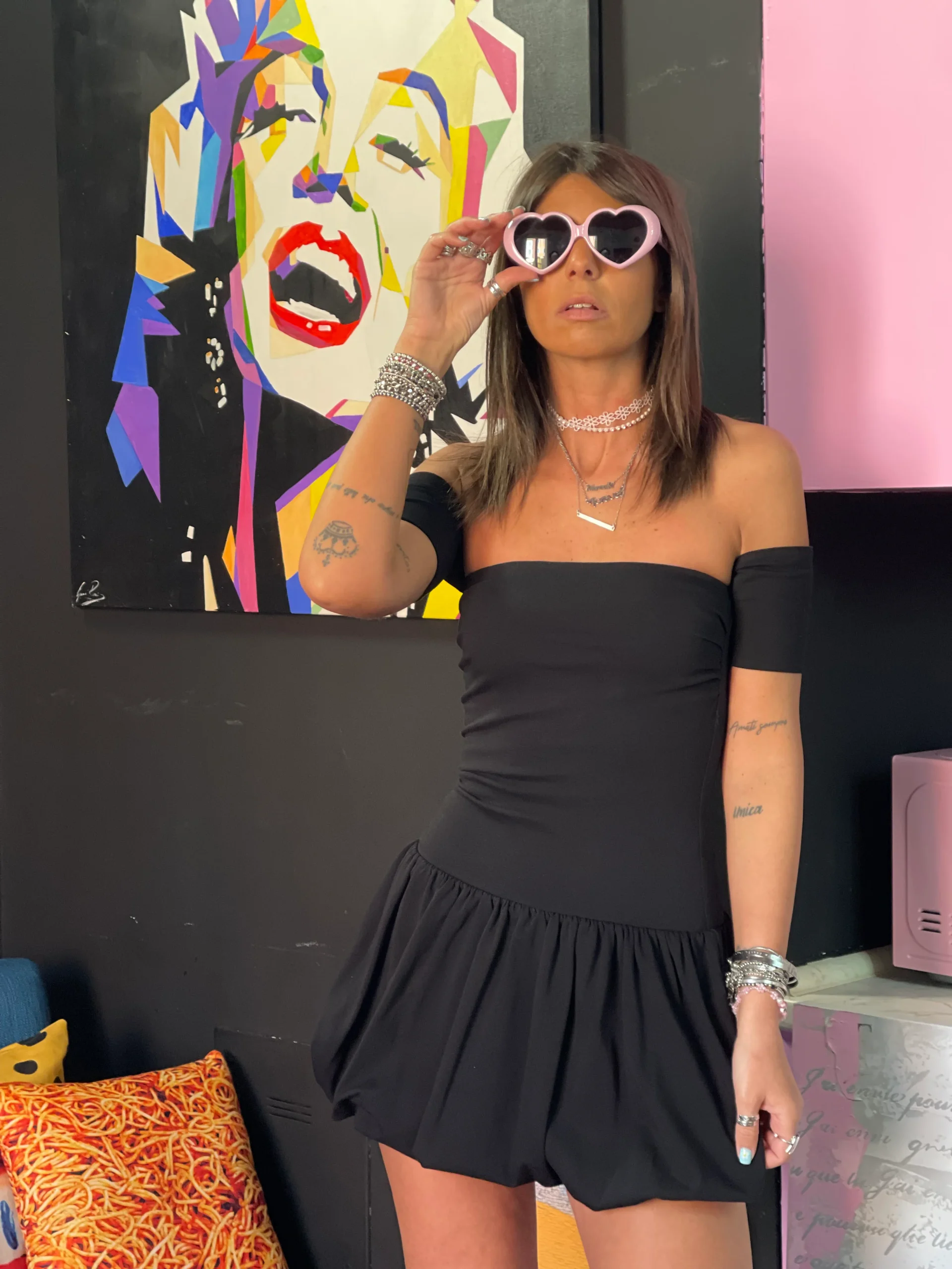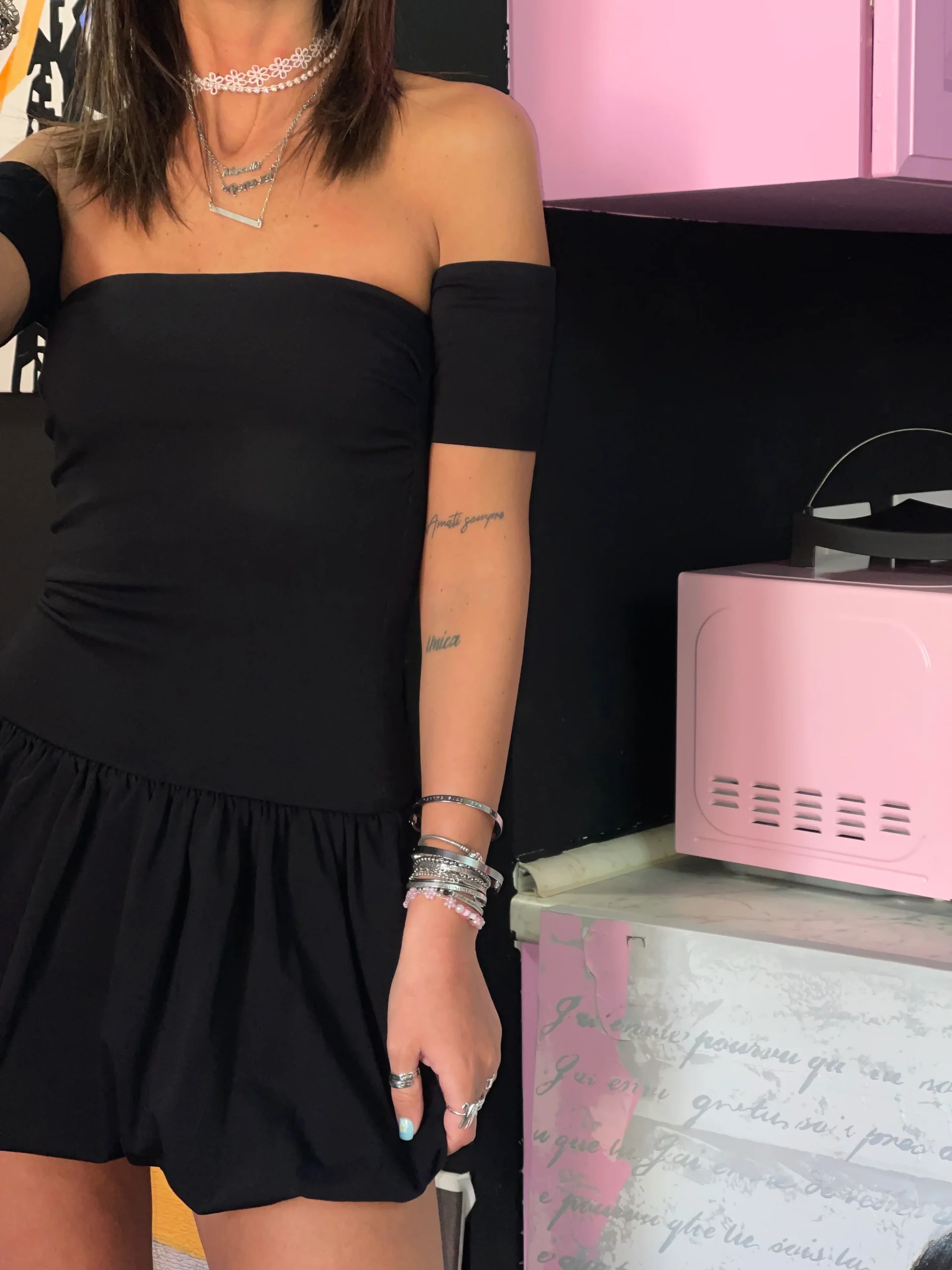 Descrizione: Vestito corto con scollo dritto e spalle scoperte. Dettaglio di fodera interna. Orlo a palloncino. Vestibilitร aderente.
