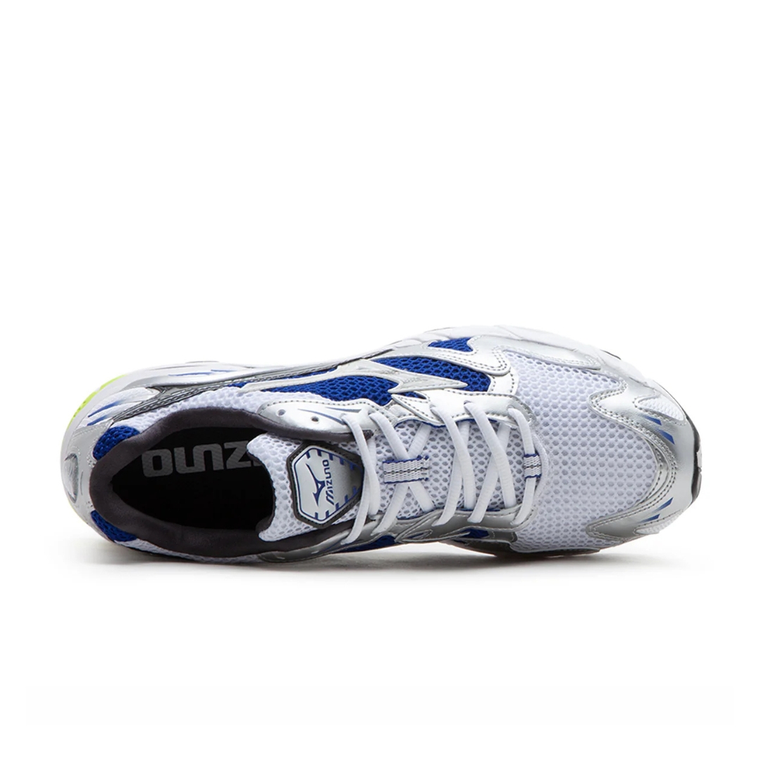 Wave Runner sportiva in una colorazione retrรฒ. Tomaia in mesh bianco e blu con dettagli in pelle argentata e dettaglio grigio.