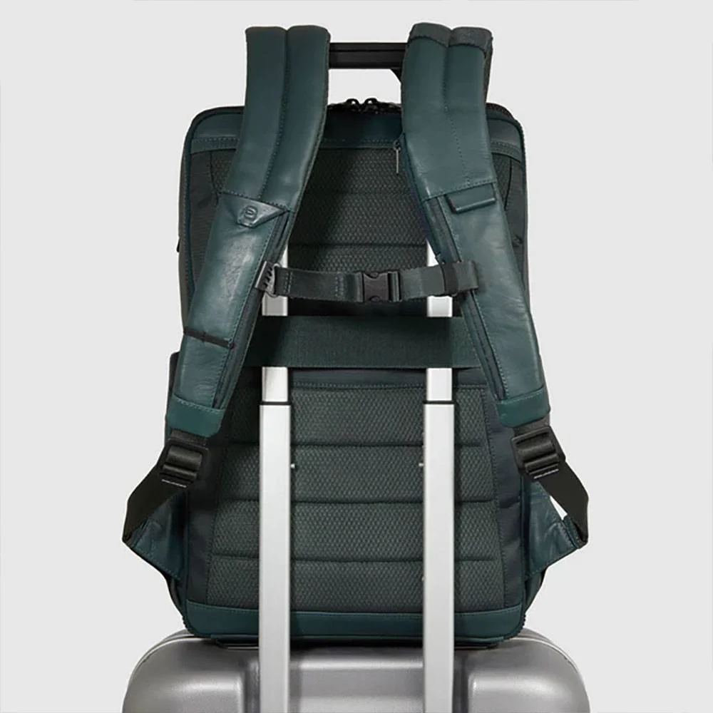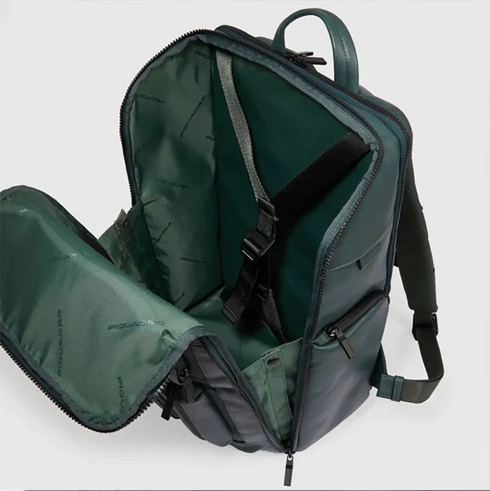 Zaino Piquadro porta pc e iPadPro 12,9″ in tessuto riciclato e pelle con protezioni antiurto e anti frode RFID e aggancio per luce portatile da bici.