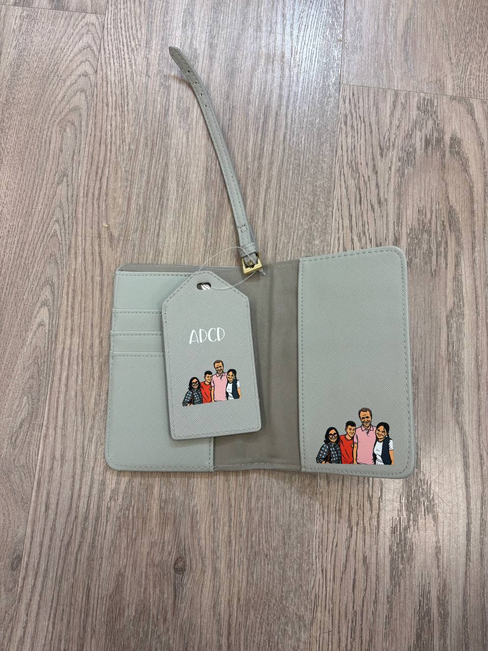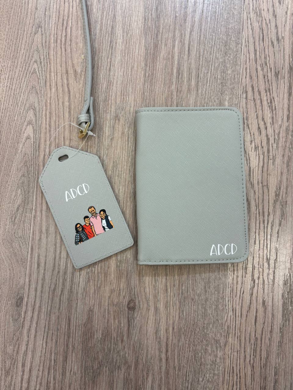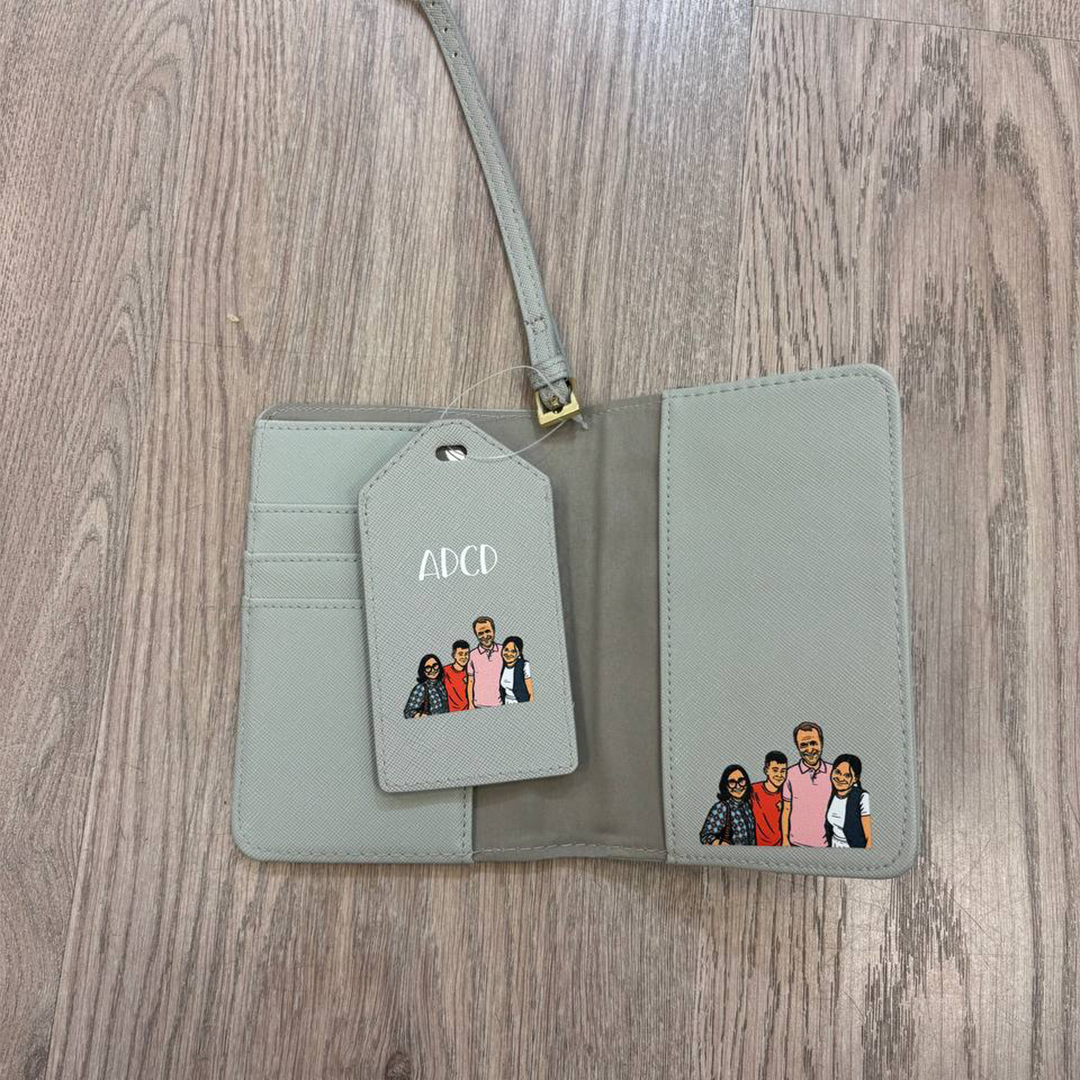 Kit viaggio comprensivo di porta passaporto e tag da appendere al borsone o alla valigia 100% ecopelle, vari colori disponibili nelle tonalitร pastello. Personalizzabile con foto della famiglia in modalitร fumetto, sull’etichetta ed all’interno del passaporto, con l’aggiunta delle iniziali dei nomi sia sull’etichetta che fuori la custodia passaporto Metti nel carrello il prodotto e una volta effettuato l’ordine manda la foto a [email protected]