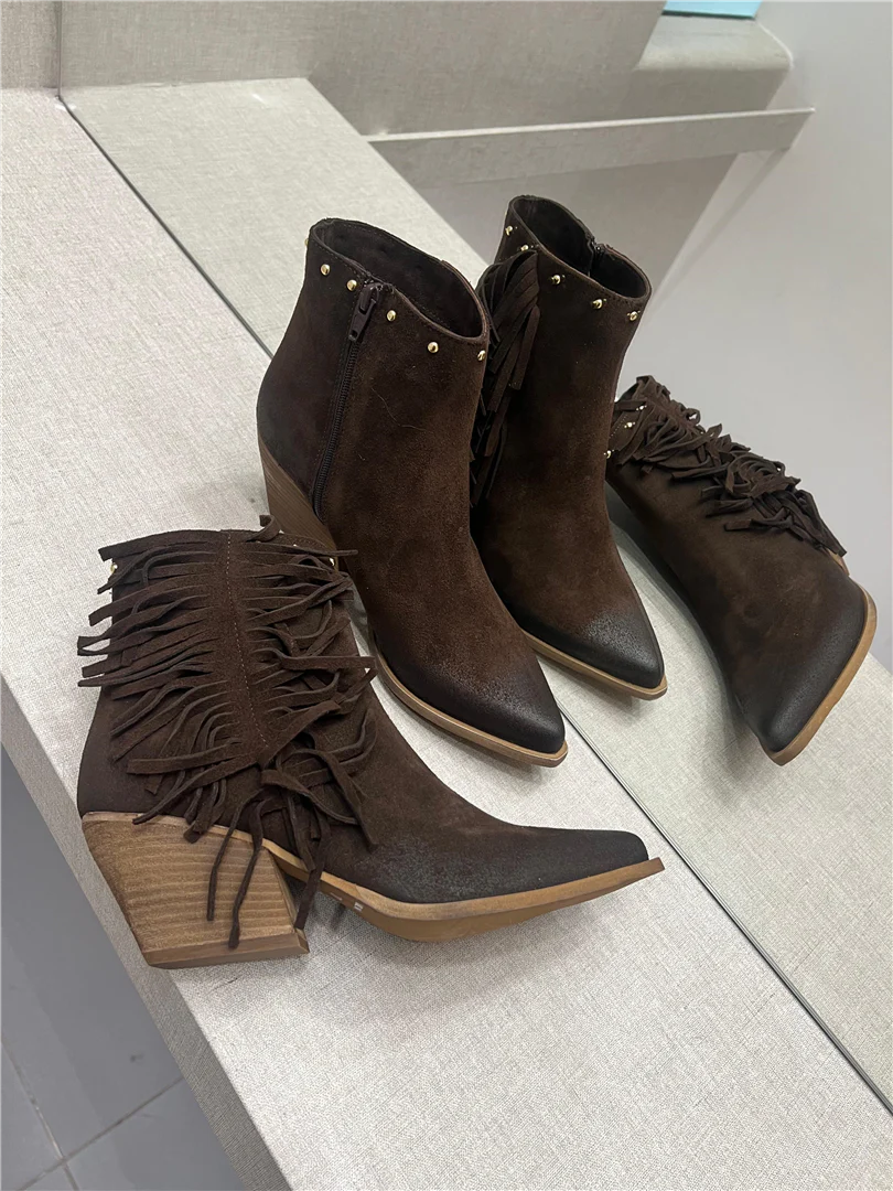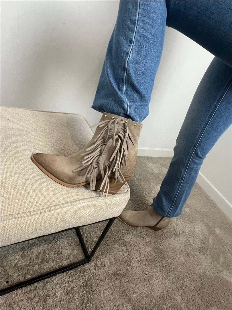 Stivaletti texani donna firmati Via Mondana in morbido camoscio taupe con borchie dorate e frange laterali. Tacco medio effetto legno e zip interna per una calzata pratica e confortevole. Perfetti per look western, boho e casual chic di stagione.