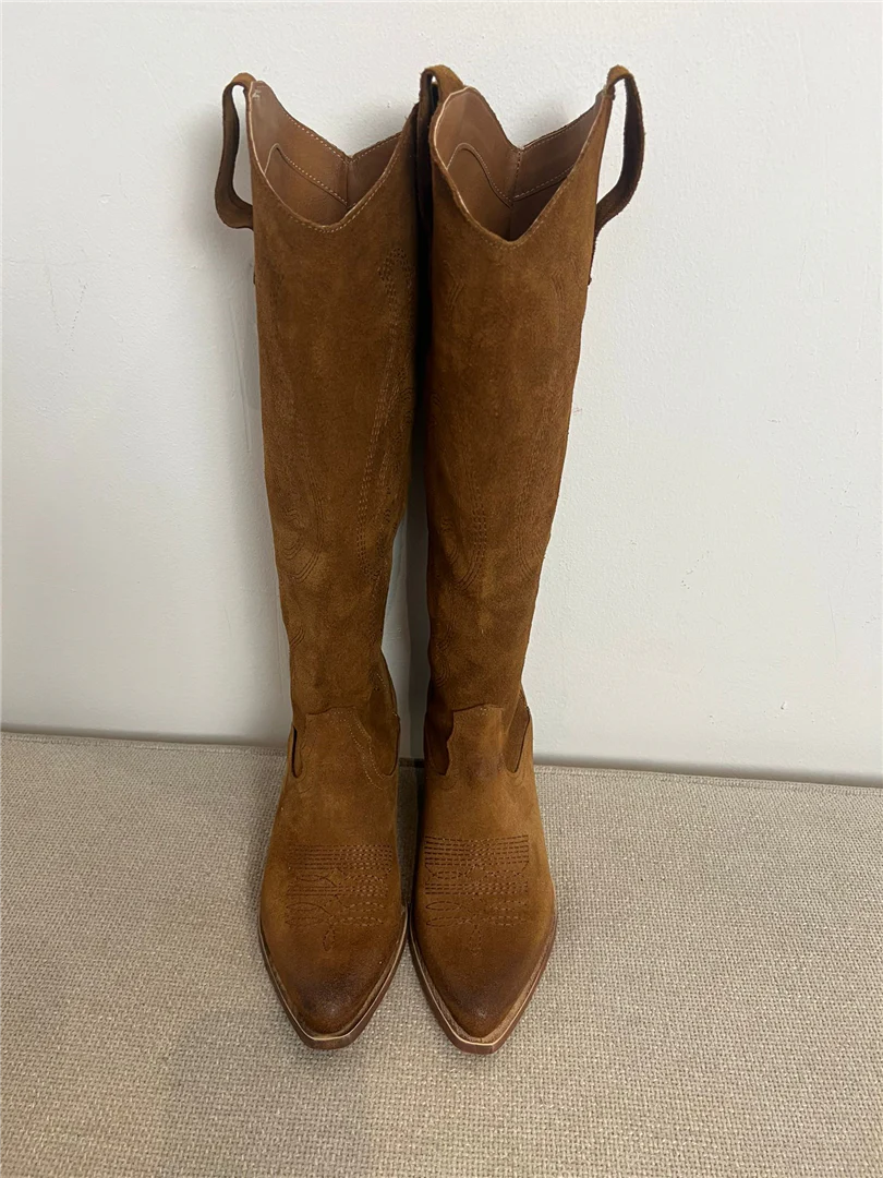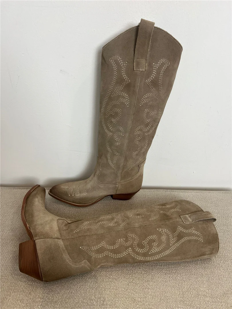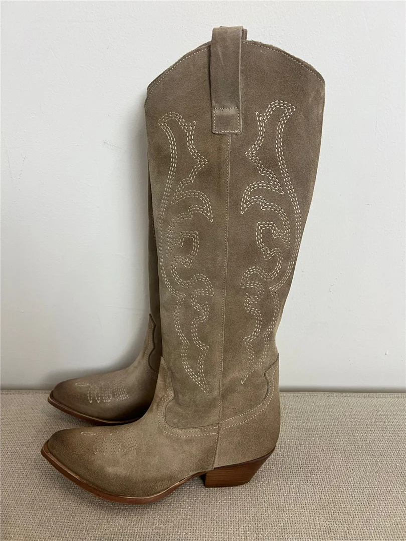 Stivali texani donna Via Mondana alti in morbido camoscio con ricamo western tono su tono. Gambale alto strutturato, punta affusolata e tacco medio effetto legno per un look deciso e femminile. Perfetti con jeans skinny, abiti boho o gonne midi.