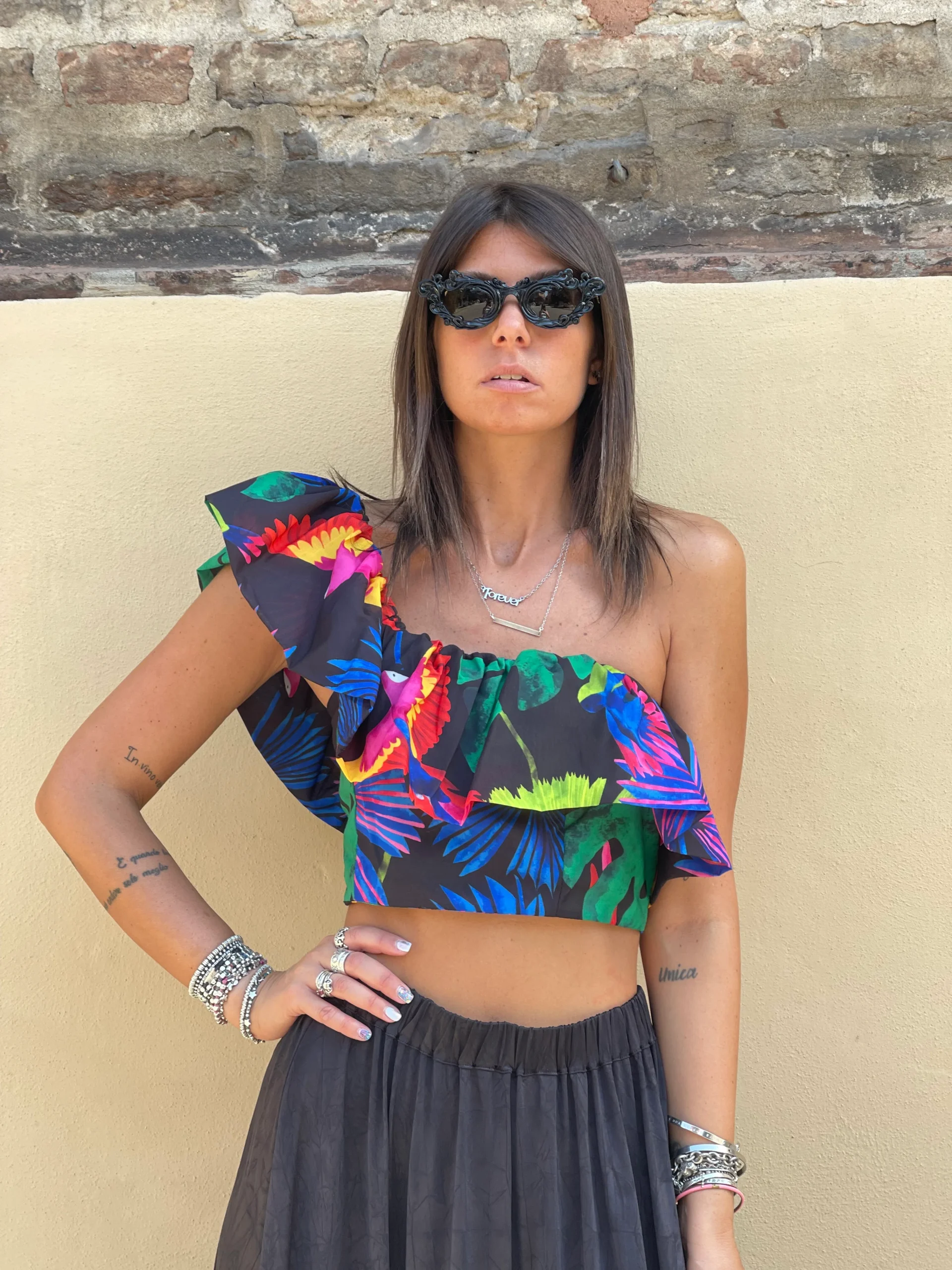 DESCRIZIONE: crop top monospalla con volant ed elastico nella schiena.