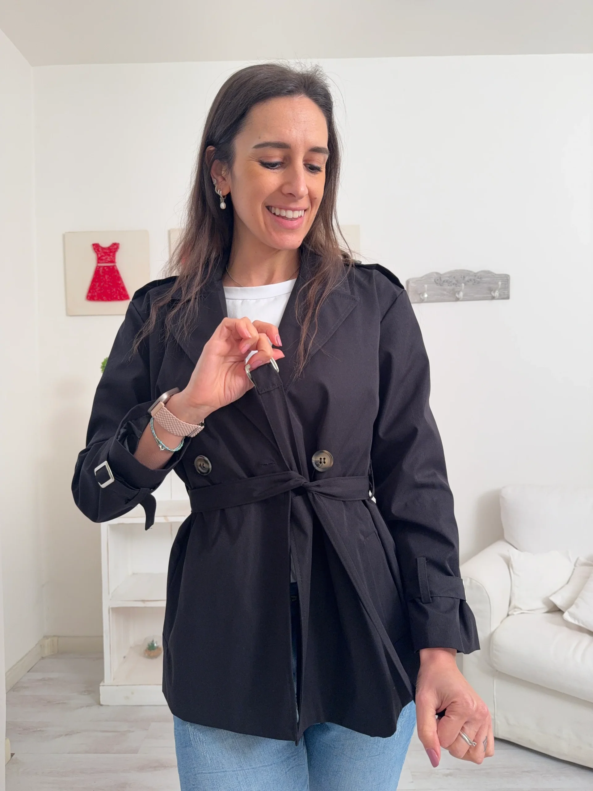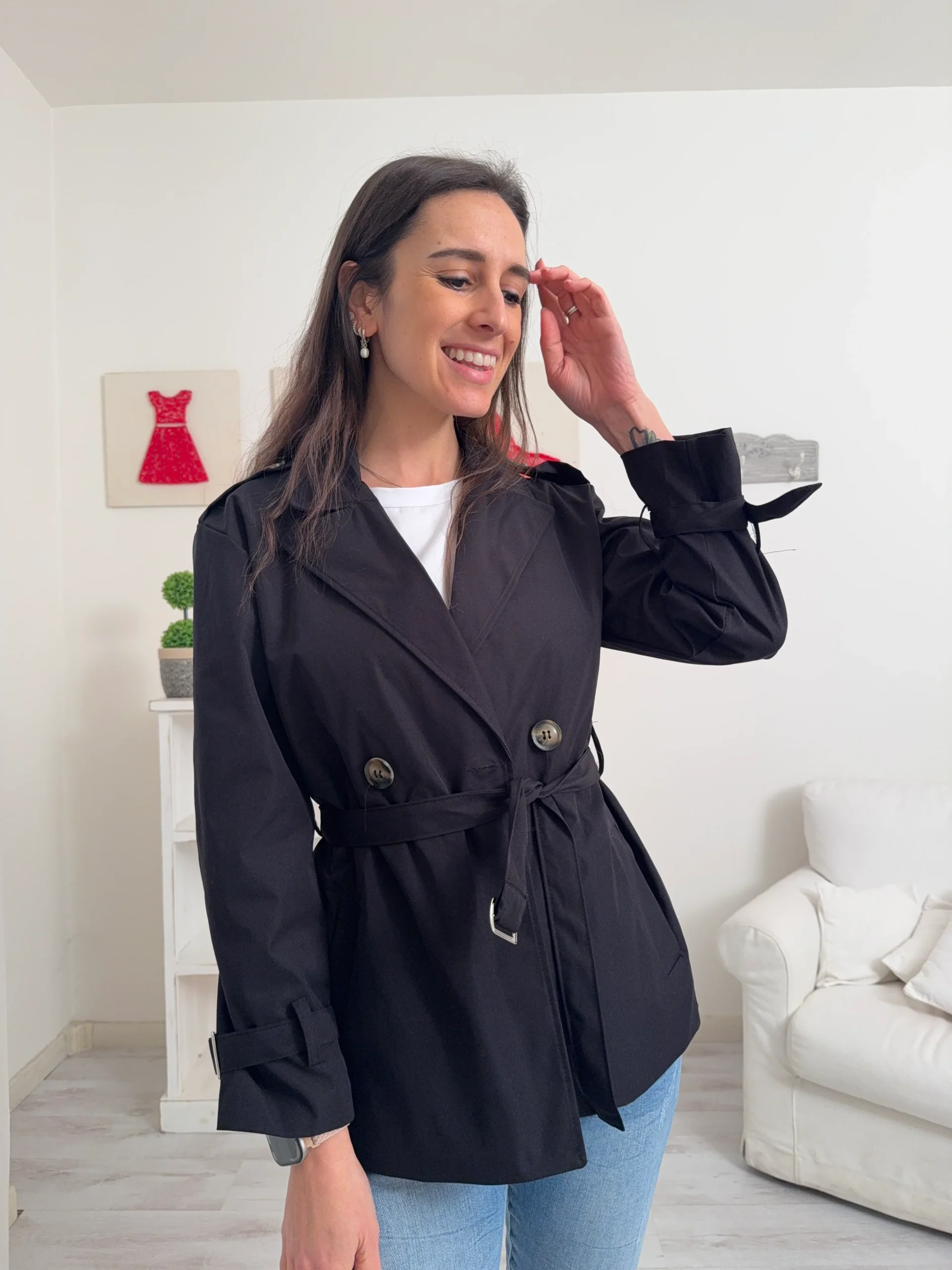 Descrizione: Trench con fodera interna, 2 taschini laterali e chiusura doppio petto con bottone e laccio.