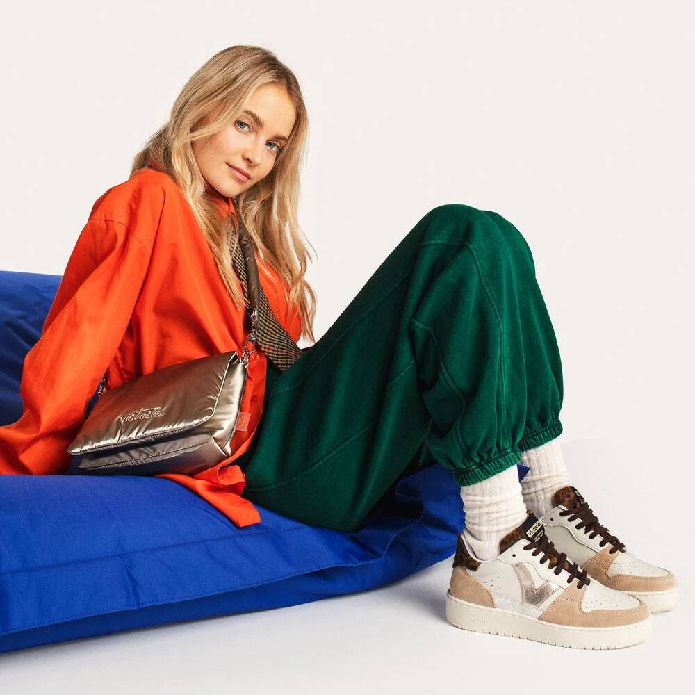 Sneakers per donna di Victoria Shoes realizzati in Spagna con materiale effetto pelle e una combinazione di pezzi sovrapposti in camoscio e metallizzati. Dettagli animalier sul retro e sulla linguetta in tono con i lacci. Eleva il tuo stile con la suola da 3 cm realizzata con oli vegetali per un minore impatto ambientale.
