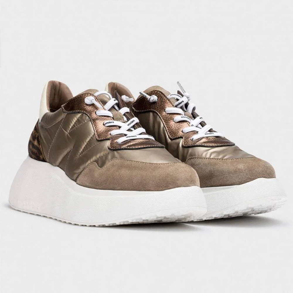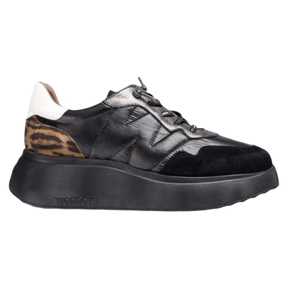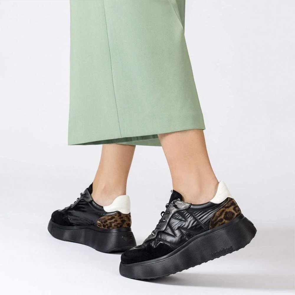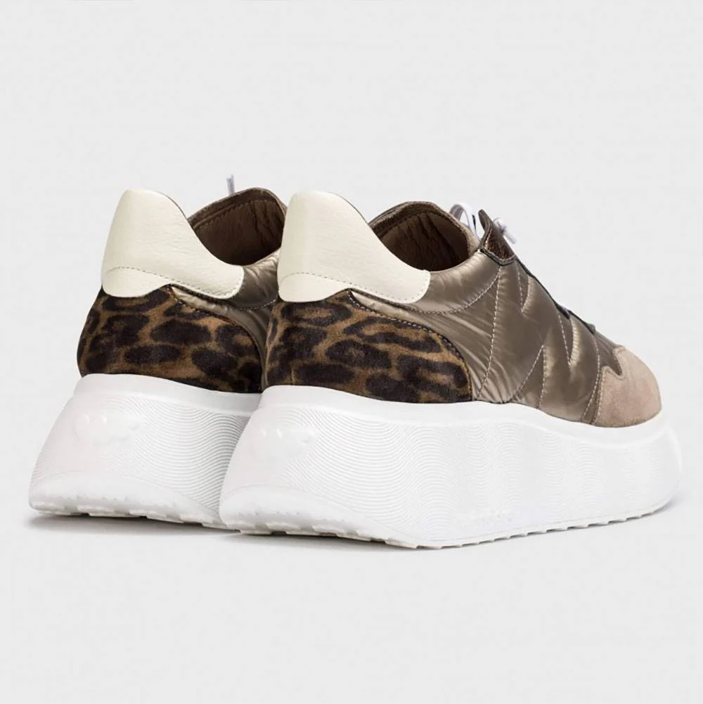 Sneakers Roma marroni. Questa sneaker in pelle e tessuto ha un fondo platform di 5 cm, stampa animalier sul tallone, l’iconica W cucita sul lato esterno e una chiusura con lacci elastici. La sua suola, sviluppata utilizzando la tecnologia WondersFlyโข, offre una leggerezza incomparabile e un comfort straordinario. Inoltre, la soletta rimovibile MemoryGel si adatta perfettamente alla forma del piede, offrendo un comfort eccezionale a ogni passo.