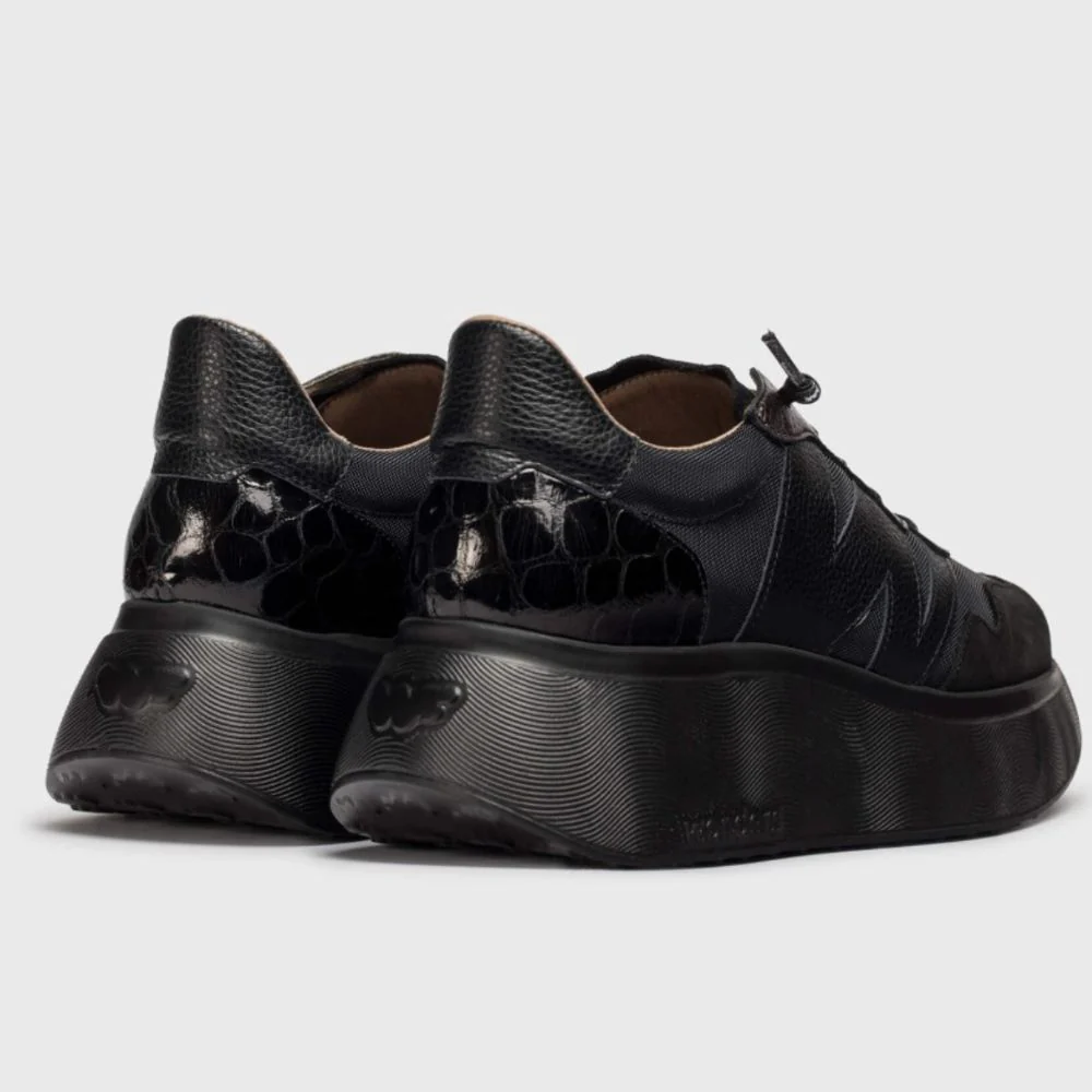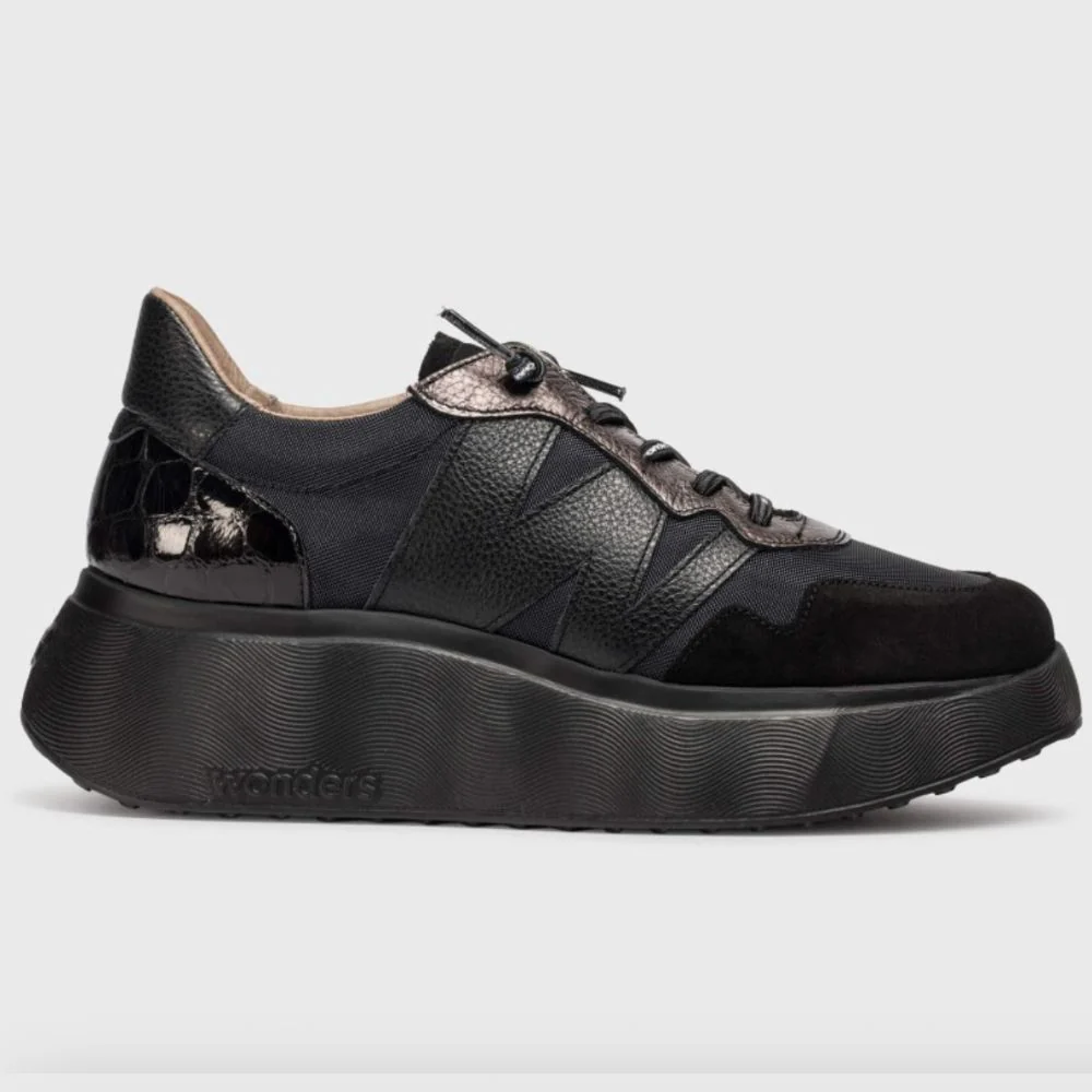 Sneakers ROMA 31 realizzate in un mix di pelle e tessuto nei toni del nero. Il plateau di 5 cm nel punto piรน alto rende questo modello la perfetta fusione di stile e funzionalitร , evidenziato dalla nostra iconica “W” in pelle testurizzata sul lato esterno. I lacci elastici garantiscono una calzata pratica ed elegante. La suola WondersFlyโข di XL EXTRALIGHTยฎ assicura una leggerezza eccezionale e un comfort che dura tutto il giorno. La soletta interna rimovibile in MemoryGel offre un supporto personalizzato.